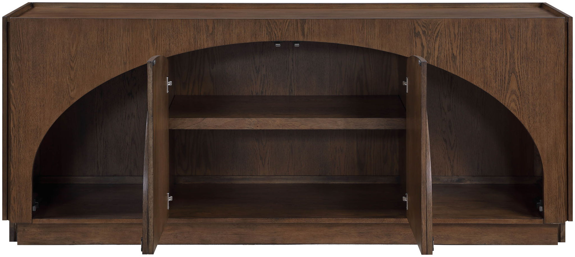 Curved detailing and a rich brown walnut finish give the Everson solid wood and oak veneer sideboard a warm, mid-century modern soul. Crafted to bring texture and depth to any dining or living space. With clean lines and timeless appeal, this piece offers both form and function in a refined silhouette.
