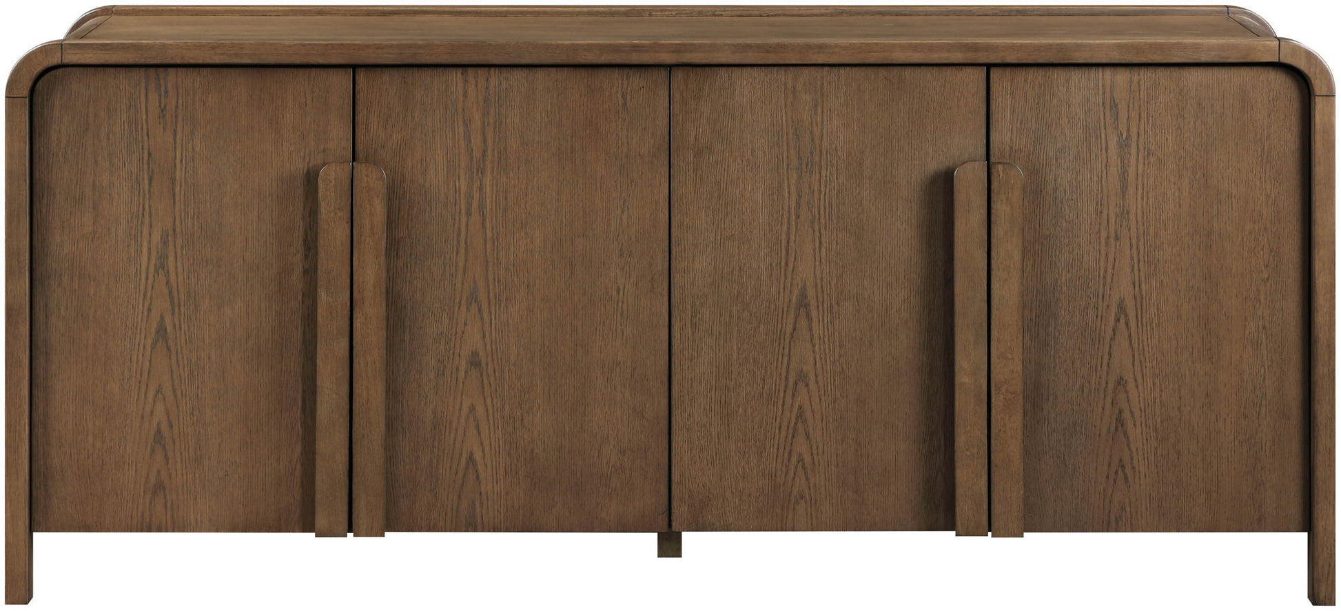 Rich oak veneer and solid wood give the Harmony sideboard its warm, mid-century appeal, while curved edges soften the silhouette. Vertical sculptural pulls add a bold, architectural touch that feels both classic and fresh. Whether storing dinnerware or styling your favorite decor, this piece brings refined versatility to any room.