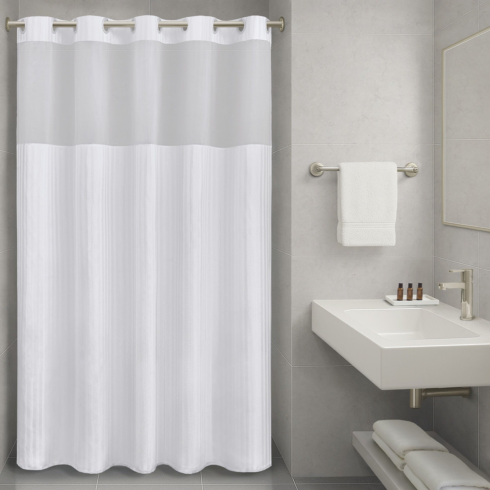 Our Bath Guardian® Premium Shower Curtain offers durable protection for the bath and prevents water from splashing outside the tub. A subtle stripe pattern adds a touch of style yet will fit into any bath decor and a voile window allows light into the shower while still maintaining privacy. The all-in-one design allows for easy installation and removal for laundering without the added cost of shower curtain rings. Each curtain comes with a snap-in liner for an extra level of protection and makes these products incredibly easy to launder. All Bath Guardian® shower curtains include magnets on their liners for a secure fit and are made from durable polyester. Our Bath Guardian® curtains and liners are also treated with our Fuze® permanent and all natural antimicrobial to resist mold and mildew and reduce microplastic and microfiber shed into the environment.