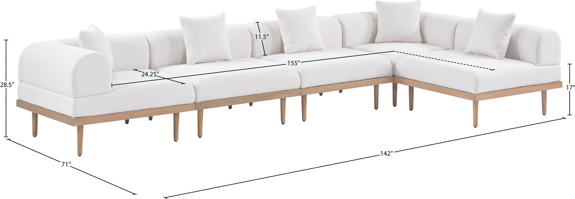 Laguna - 5 Piece Resilient Water Resistant Fabric 142" Upholstered Outdoor Patio Modular Sectional - Cream