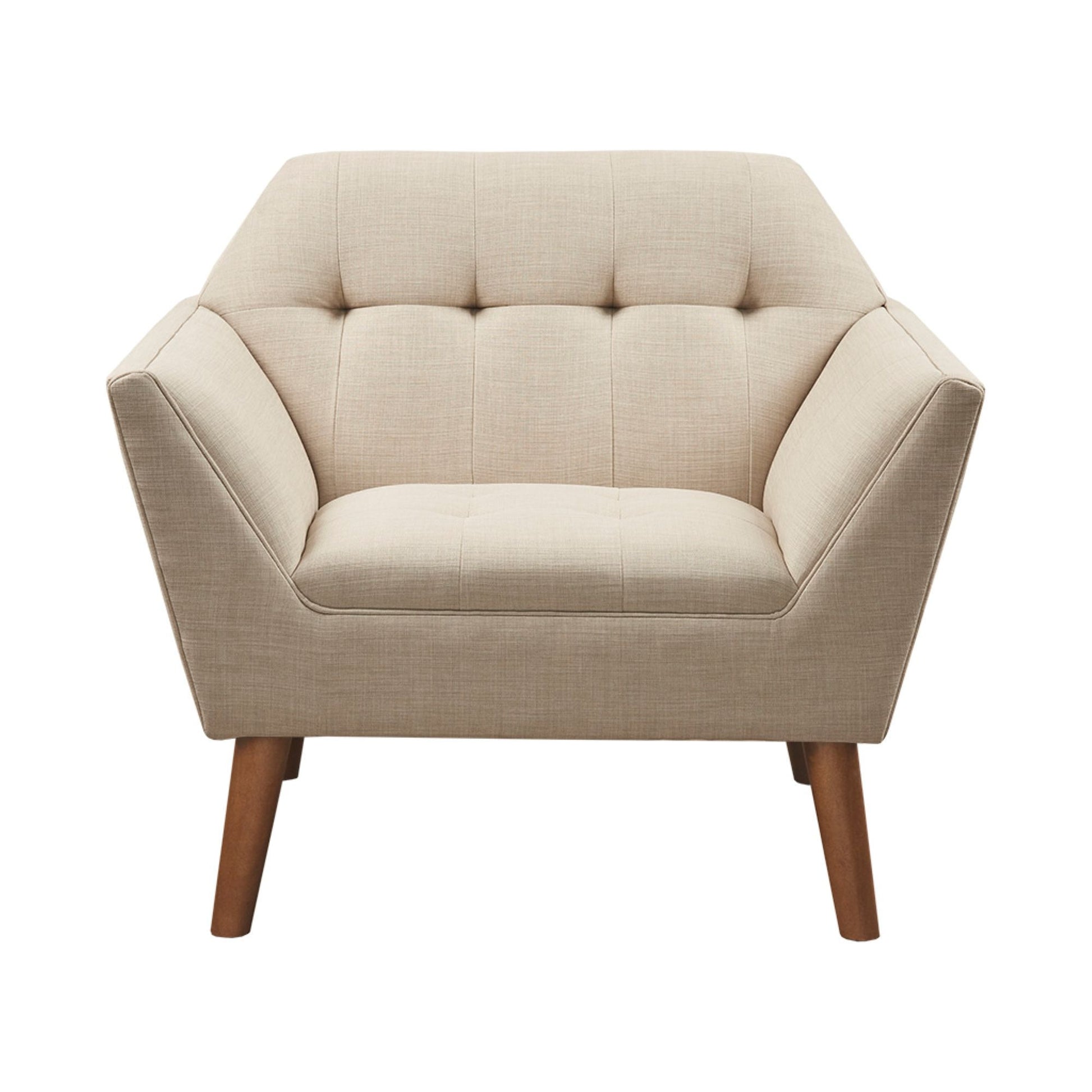 Elevate your living area with the mid-century allure of the INK+IVY Newport Upholstered Armchair. Featuring a wide 37-inch profile and a striking angular silhouette, enhanced by hand-tufted detailing, this chair makes a bold statement. The generously sized chair includes a tailored tight back and seat, offering plush, supportive comfort—perfect for lounging, reading, or relaxing. The plain, woven upholstery fabric made with filament yarn ensures durability and resilience to pilling. The solid wood legs add to its sturdy appeal. Ideal for the living room, bedroom, home office, and more, this versatile accent chair will transform your space. Bring home this stylish chair today!