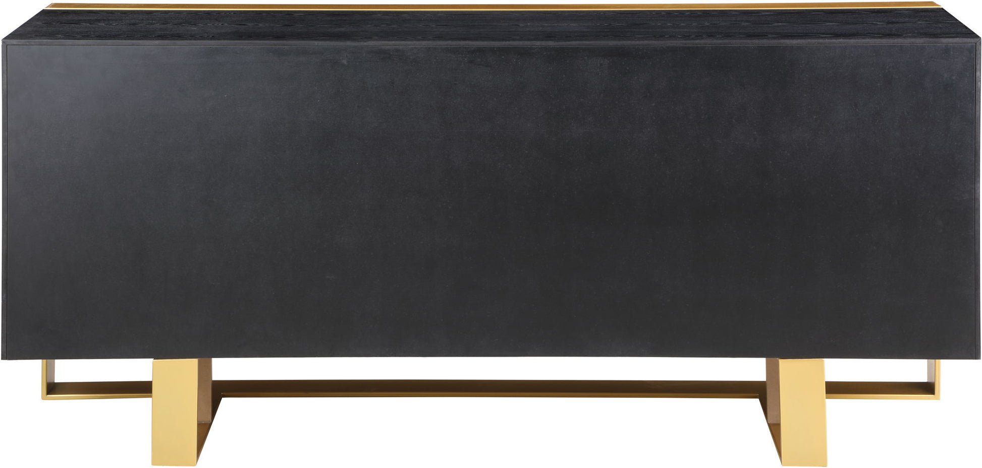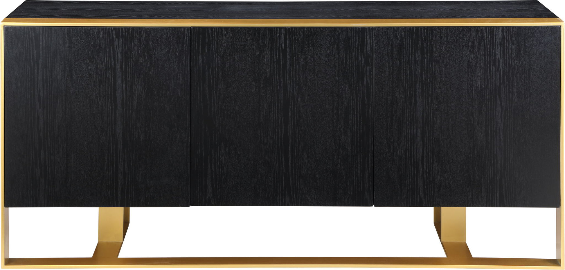 Lend glam to the dining area with this Sherwood sideboard buffet. This uber contemporary design features a contrasting color scheme with black oak wood veneers trimmed in brushed gold with a gold iron base. Crafted from solid wood and metal, this handsome unit features two shelves behind three doors for storing and organizing items you use most in your dining space, from dishes to serving pieces and more.