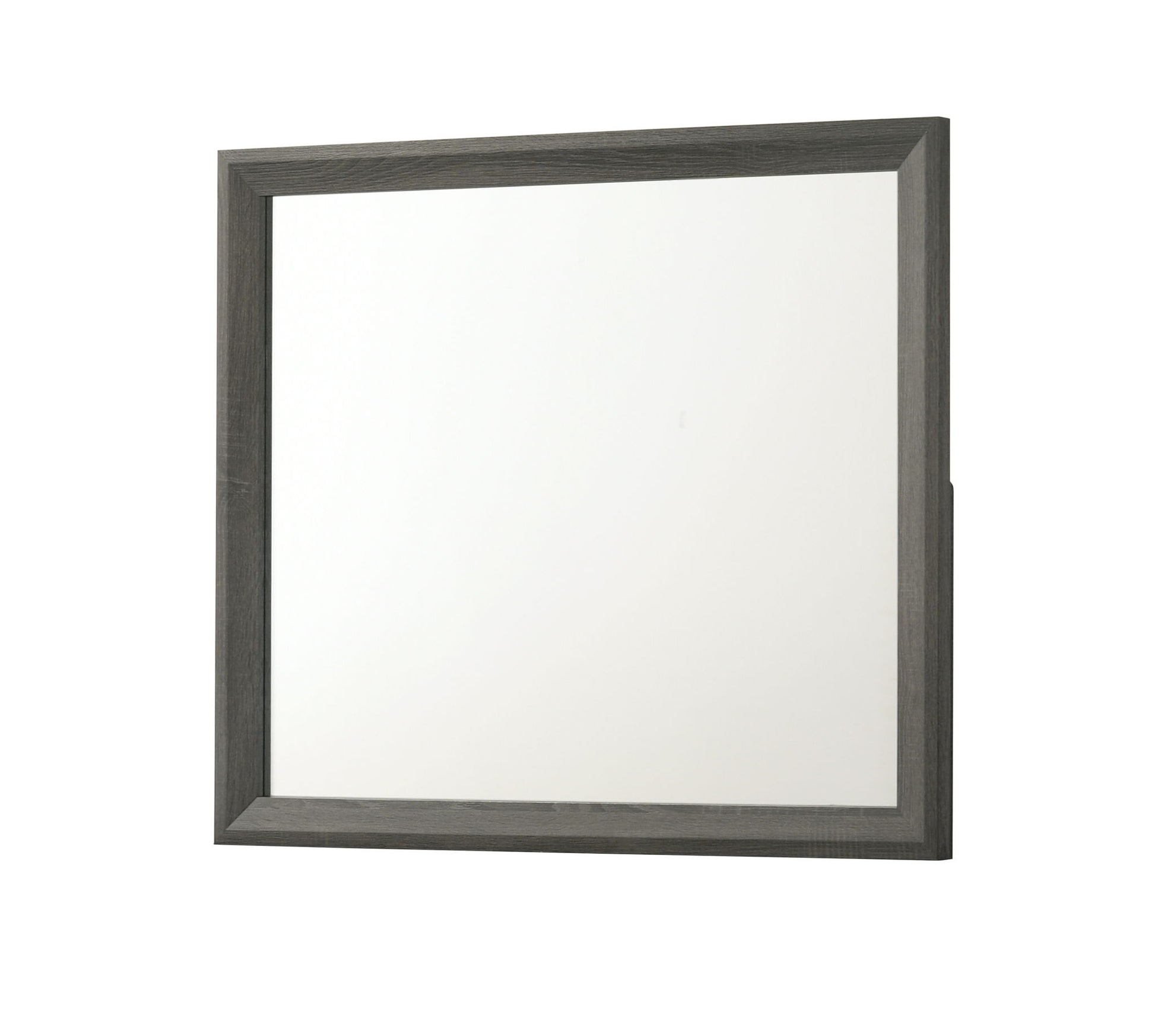This bedroom collection encapsulates a blend of contemporary design and rustic charm. The centerpiece, a bed with a distinguished chevron patterned headboard, evokes a sense of craftsmanship and texture, infusing the space with character. Flanking the bed are matching pieces, each exhibiting clean lines and a weathered wood finish that suggests a lived-in elegance. The dresser, complemented by a substantial mirror, along with the tall chest, offer ample storage solutions with understated metal handles that enhance the modern farmhouse aesthetic. A nightstand completes the set, its compact design making it a practical addition to the suite.