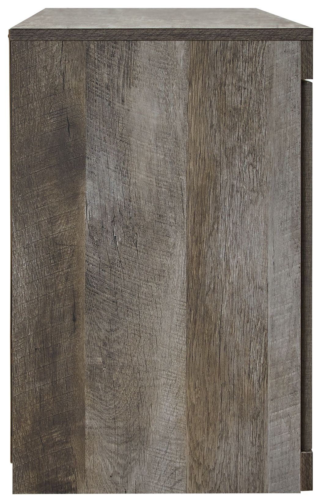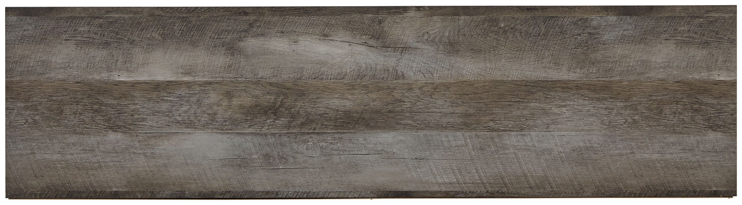 This TV stand is sure to win your heart with its daring take on modern rustic design. Its crisp, clean minimalist-chic profile is enriched with a striking replicated oak grain, thick plank styling and a rustic gray finish for that much more authentic character. Crossbuck detailing adds a brilliant barn door inspired touch. Opt for the optional fireplace insert (sold separately) for added warmth.